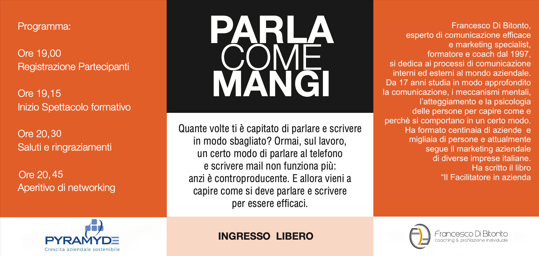 Francesco Di Bitonto – esperto di comunicazione efficace, formatore e marketing specialist. Da oltre 17 anni studia la comunicazione e i meccanismi mentali che influenzano il comportamento delle persone. Fondatore della società Pyramyde S.r.l., è un consulente esperto nel miglioramento delle relazioni interpersonali, nella gestione del tempo e dell’emotività, nonché nella leadership aziendale. Grazie alla sua specializzazione in Programmazione Neuro-Linguistica (PNL) e intelligenza emotiva, aiuta individui e aziende a sviluppare competenze di comunicazione efficace, gestione dei conflitti e produttività, con l’obiettivo di creare un clima aziendale positivo e funzionale.